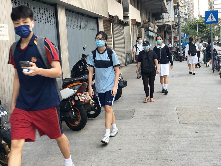 Senior secondary school pupils return to school yesterday morning in the Avenida Marginal do Lam Mau and Avenida Horta e Costa area.