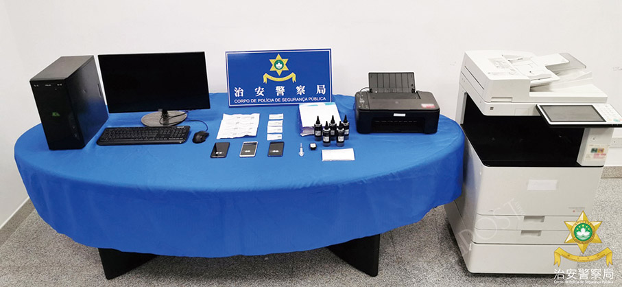 This undated handout photo provided by the Public Security Police (PSP) yesterday shows evidence seized from the suspects such as a computer, a printer, a copier and forged arrival cards displayed during yesterday’s special press conference about the case in the pressroom of the Judiciary Police (PJ) headquarters.