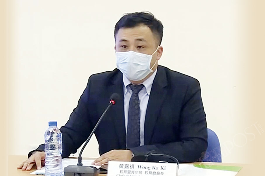 Wong Ka Ki, who heads the Education and Youth Affairs Bureau’s (DSEJ) Education Department, addresses yesterday’s press conference at the Health Bureau (SSM) about the city’s novel coronavirus (COVID-19) situation. Photo: GCS