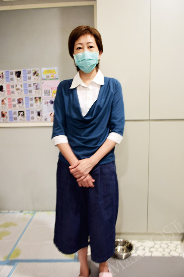 Everyone Stray Dogs Macau Volunteer Group (ESDMVG) President Chan In Cheng poses at the ESDMVG dog shelter reception room during the 2nd of “Caring Adoption Day”on Saturday.