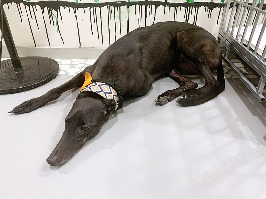 Cookie, a 6-year-old female Greyhound up for adoption in the “Caring Adoption Day” on Saturday.