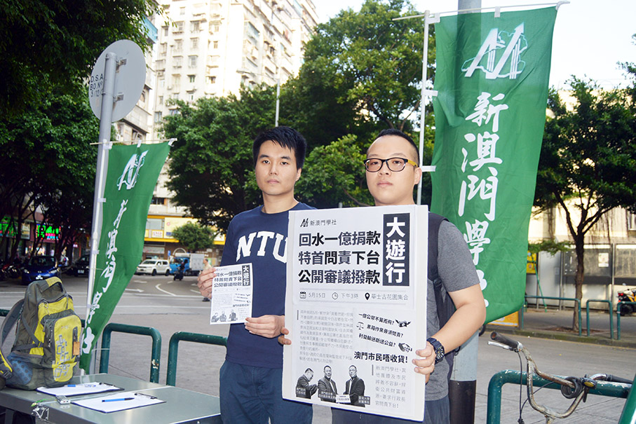 New Macau Association (NMA) key members Sulu Sou Ka Hou (left) and Rocky Chan Lok Kei pose with leaflets and a placard about Sunday’s protest, in Iao Hon district yesterday. Photo: MPDG
