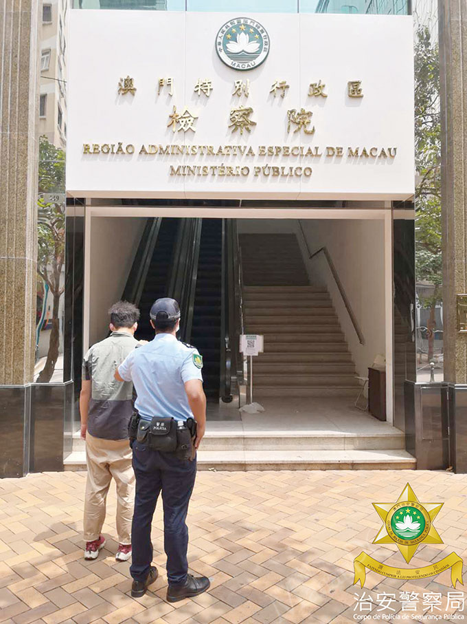 This handout photo provided by the Public Security Police (PSP) yesterday shows a PSP officer escorting the suspect to the Public Prosecution Office (MP) in Nape on Monday.