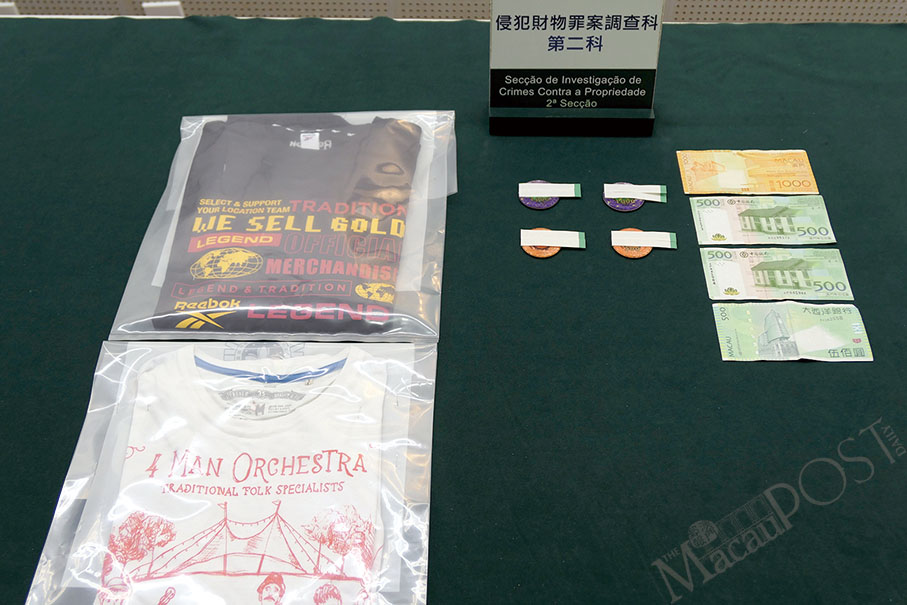 Evidence seized from the suspect’s flat such as clothes he wore during the two burglaries, pataca notes and casino chips are displayed during yesterday’s special press conference about the case at the pressroom of the Public Security Police (PSP).