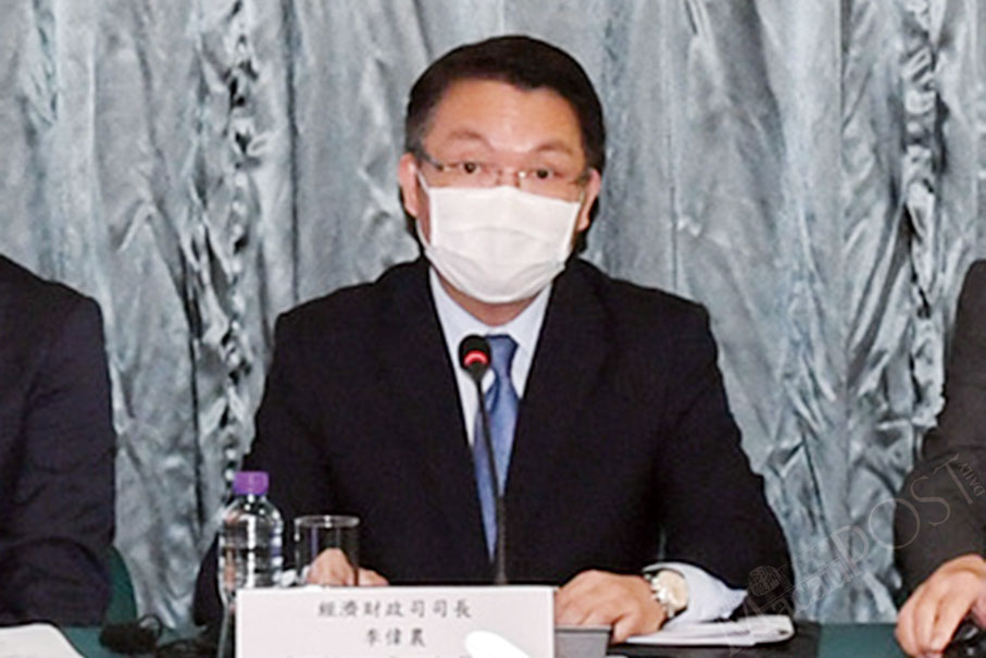 Secretary for Economy and Finance Lei Wai Nong addresses Saturday’s press conference at the Macau Business Support Centre (MBSC) in Nape about the government’s issuing of one-off grants for employees, the self-employed and companies. Photo: GCS