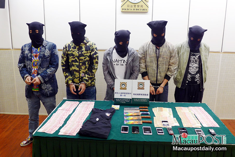 The five suspects pose in a pressroom at the Judiciary Police (PJ) headquarters in Zape, before a press briefing about their case yesterday, with evidence seized by the police on display. Photo: Iong Tat Choi