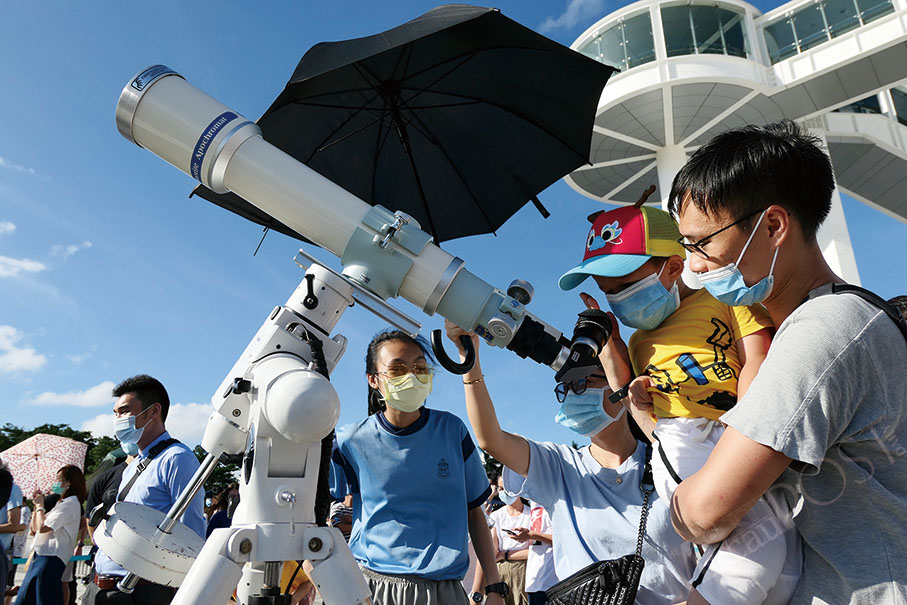 People try to see the solar eclipse through special apparatus set up outside the Macau Science Centre. It was also the Summer Solstice yesterday on the Chinese lunar calendar.