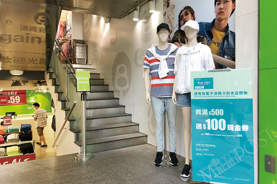 A poster promoting a special discount for consumption card shoppers is displayed at the entrance of a clothing shop in Nam Van yesterday: “Get $100 [pataca] cash coupon upon purchase of $500”.
