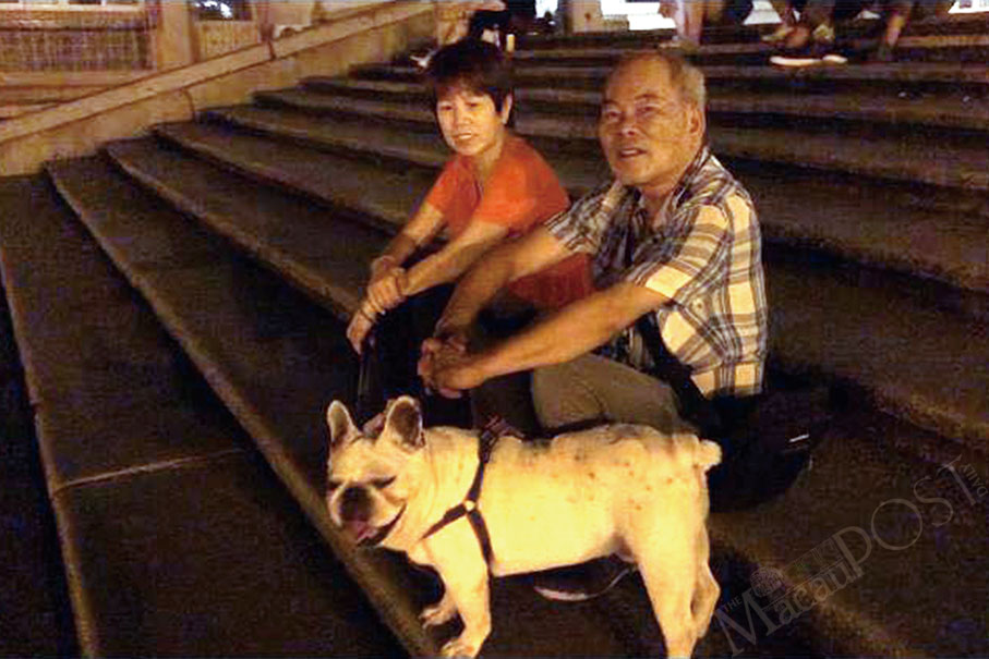 An elderly couple appearing to be in their 70s pose in front of the St. Paul’s Ruins last Monday with their beloved dog that they say is 70 in human years. Photo: Swallow Xu