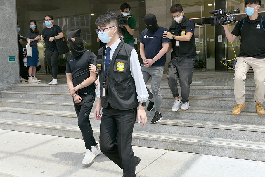The hooded suspects are escorted by Judiciary Police (PJ) officers from the PJ headquarters in Zape to a vehicle yesterday. Photos: Iong Tat Choi