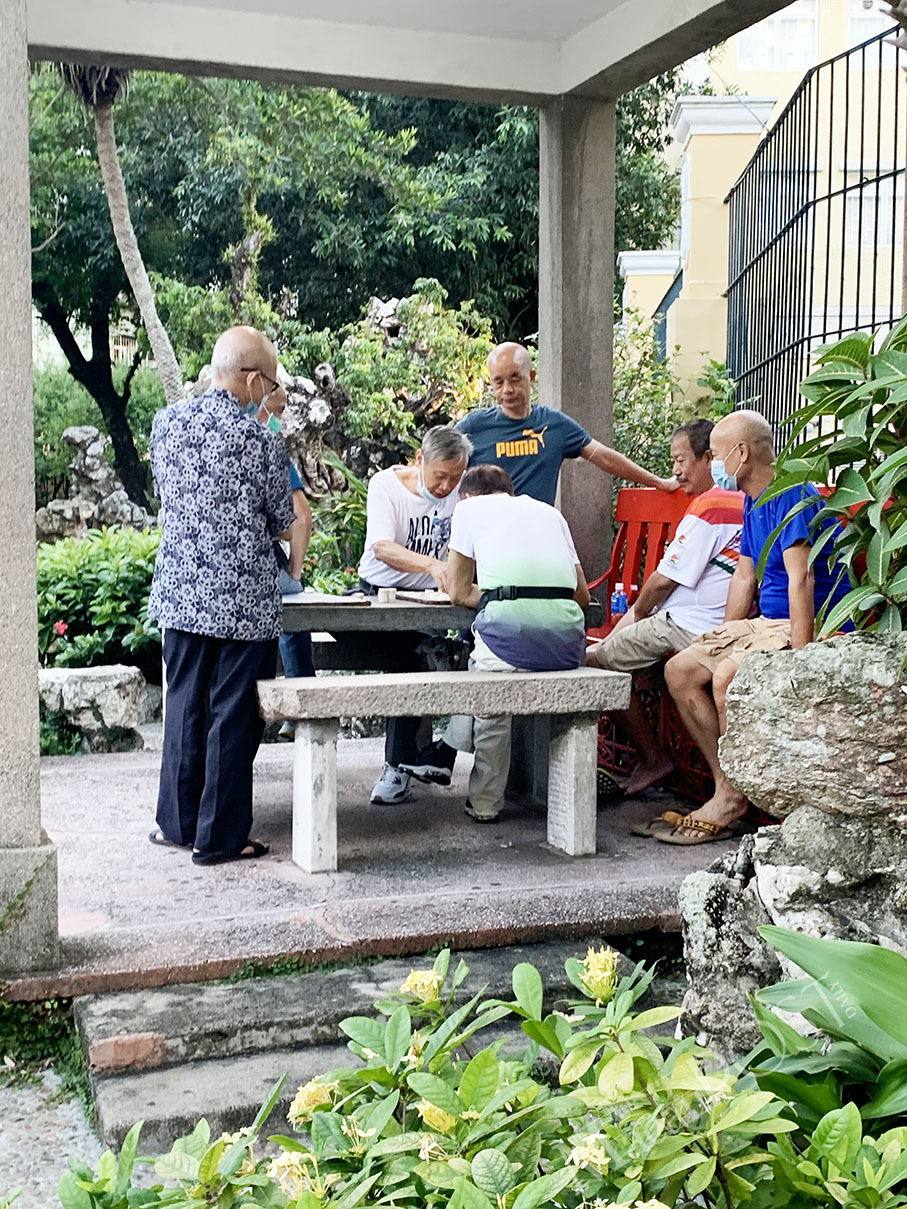Men, only some of them wearing facemasks, gather for a game of chess in Lou Lim Ieoc Garden earlier this week.