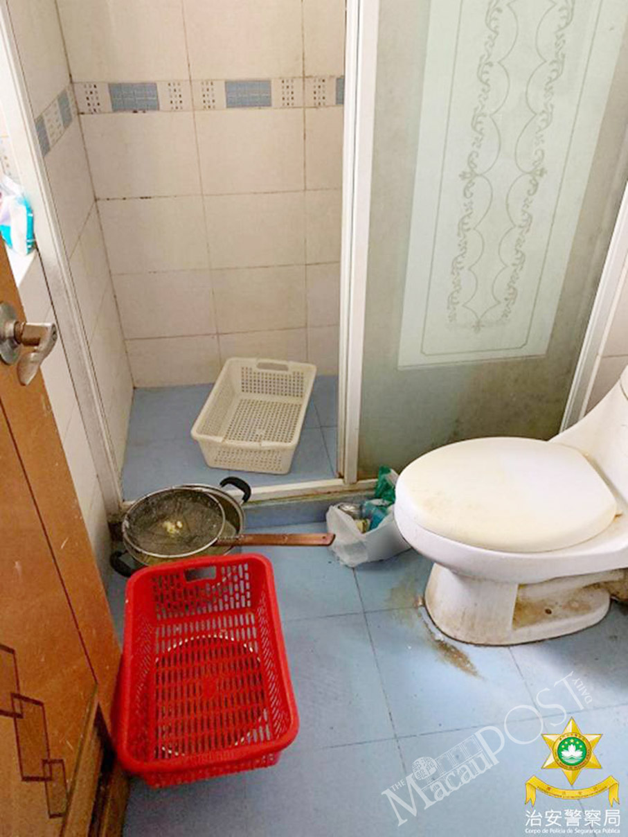 The two photos provided by the Public Security Police (PSP) on Friday show the toilet and kitchen of an illegal food processing “factory” in Taipa that they busted on Wednesday.