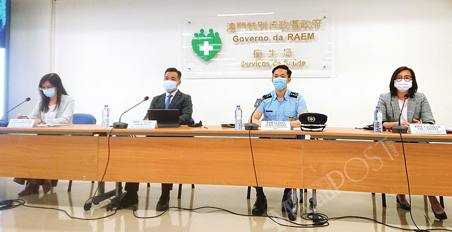 Lau Fong Chi (right), who heads the Macau Government Tourism Office’s (MGTO) Public Relations Division, speaks during yesterday’s press conference about the city’s novel coronavirus (COVID-19) situation, as Lei Tak Fai (second from right), who heads the Public Security Police’s (PSP) Public Relations Division, Alvis Lo Iek Long (second from left), a clinical director of the public Conde de São Januário Hospital Centre, and Health Bureau (SSM) Control of Communicable Diseases and Surveillance of Diseases Department Coordinator Leong Iek Hou look on. Photo: Tony Wong