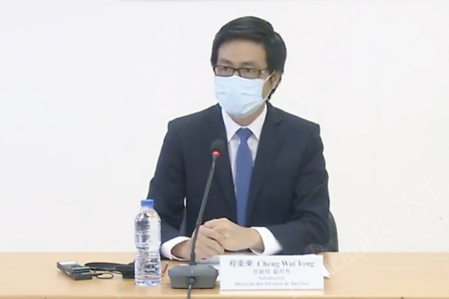 Macau Government Tourism Office (MGTO) Deputy Director Cheng Wai Tong addresses yesterday’s press conference at the Health Bureau (SSM) about the city’s novel coronavirus (COVID-19) situation. Photo: GCS