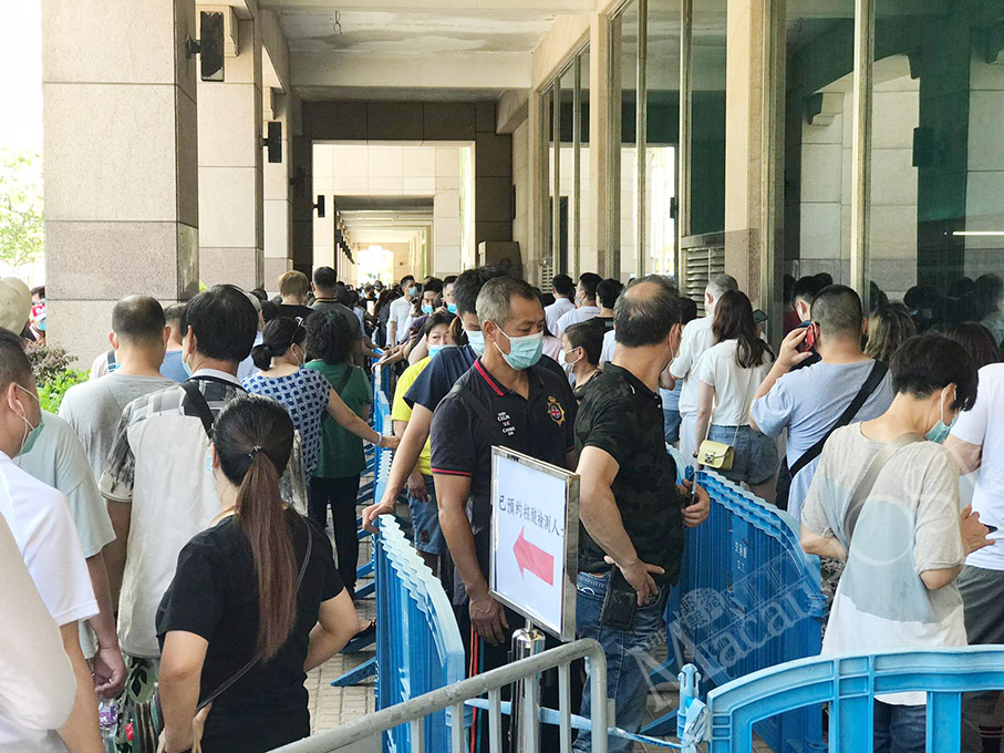 Scores of residents queue outside the Macau Forum nucleic acid testing (NAT) station in Zape yesterday afternoon. Photo: Maria Cheang Ut Meng