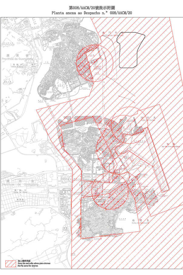 The temporarily restricted zones (“drone ban”) are marked in red on the map released by the Macau Civil Aviation Authority (AACM) yesterday.