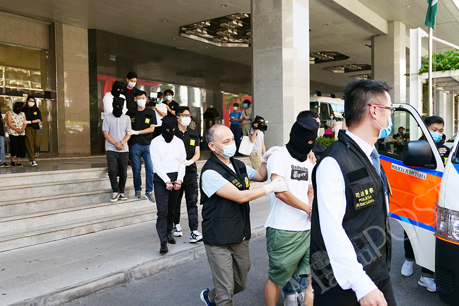The hooded fraud suspects are escorted by Judiciary Police (PJ) officers from the PJ headquarters in Zape to a vehicle yesterday. Photo: Iong Tat Choi