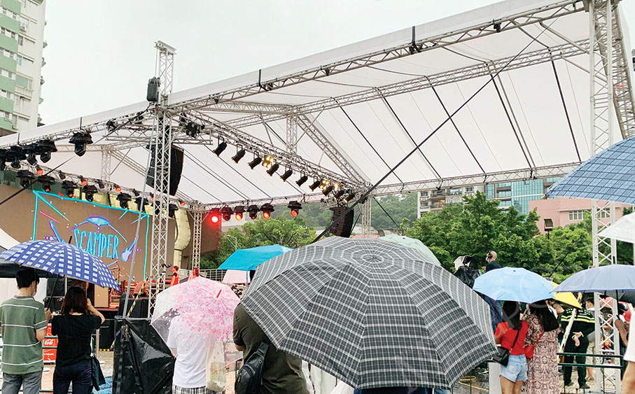 Spectators watch yesterday’s HUSH!! gig with umbrellas under the rain in Praça do Tap Seac. Photo: Nicole Iun