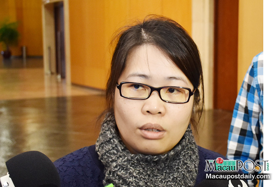 Macau Domestic Violence Legislation Coalition spokeswoman Cecilia Ho Wing Yin speaks to reporters after a meeting the legislature’s 1st Standing Committee about the domestic violence bill in March. Photo: Leong Lok Ian