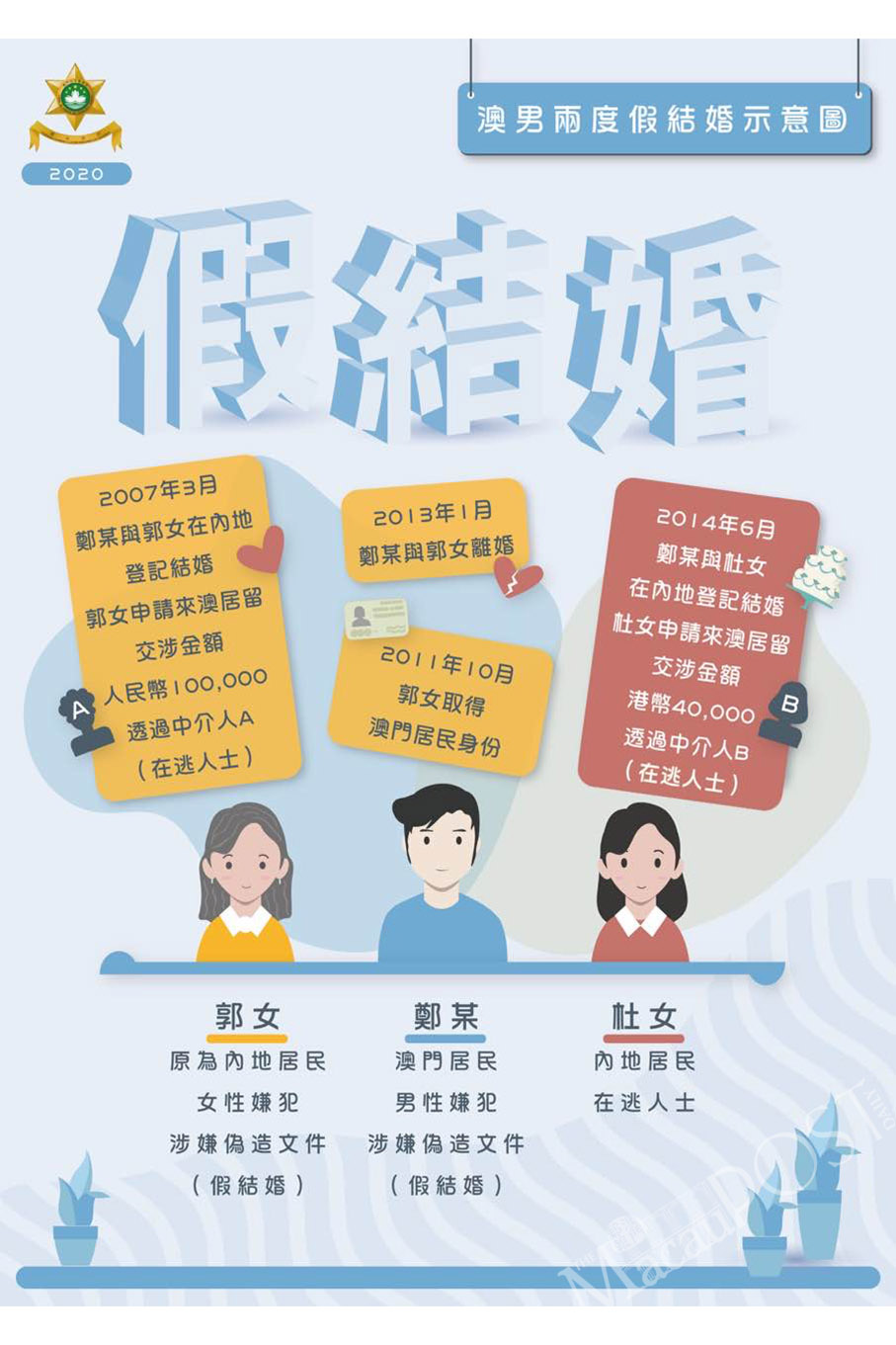 This Chinese-language diagram provided by the Public Security Police (PSP) on Monday shows how the two sham marriages involving the three suspects – Guo (left), Cheang (centre) and Du – came about.