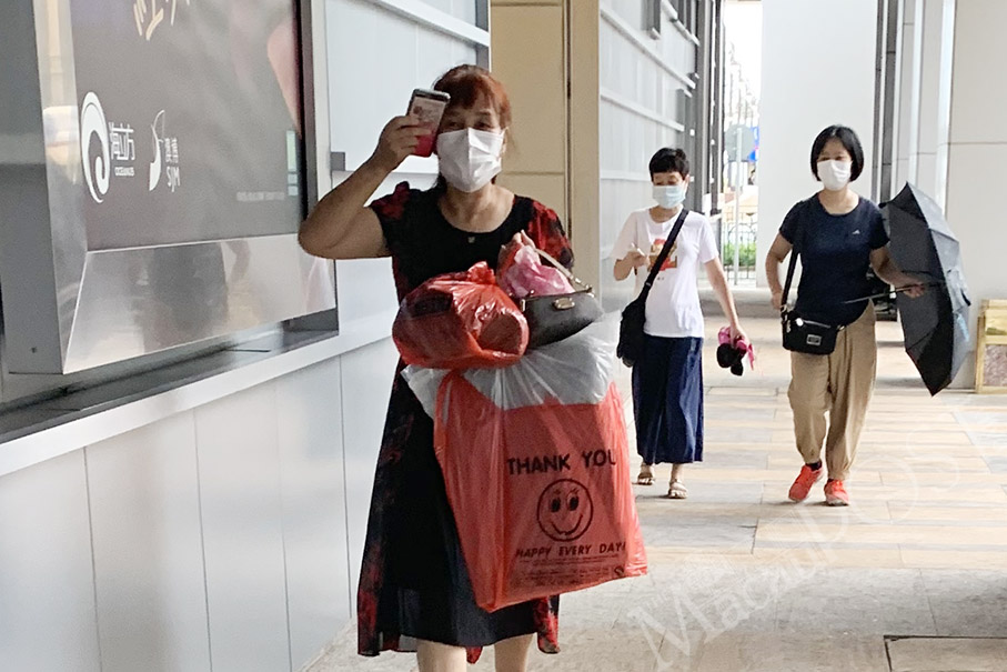 Women wearing facemasks take shelter from the rain at Oceanus Casino yesterday. Photo: Camy Tam