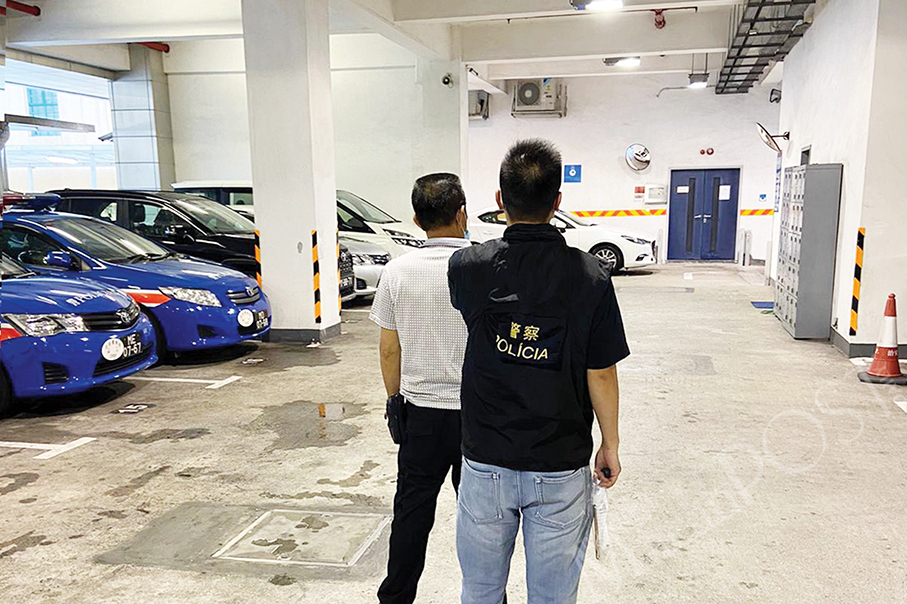 This undated handout photo provided by the Public Security Police (PSP) yesterday shows a PSP officer escorting the smartphone theft suspect in a car park.