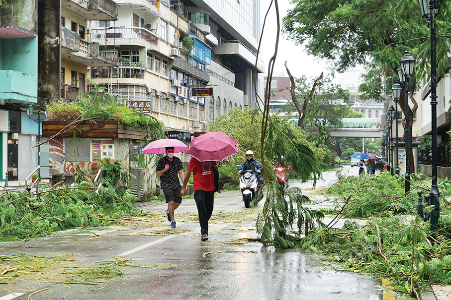 The Municipal Affairs Bureau (IAM) said in a statement yesterday that after signal No. 10 was replaced by signal No. 8, it was deploying staff members to remove the “large” number of toppled trees across the city.