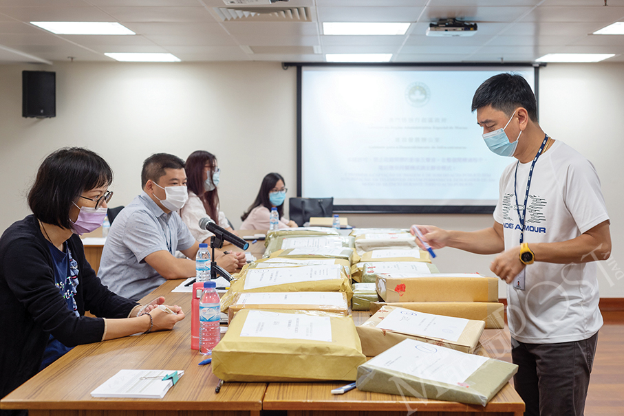 Infrastructure Development Office (GDI) officials unseal bids submitted by construction companies for the new Macau Customs Service headquarters project, at the office in Zape last week. Photo: GCS