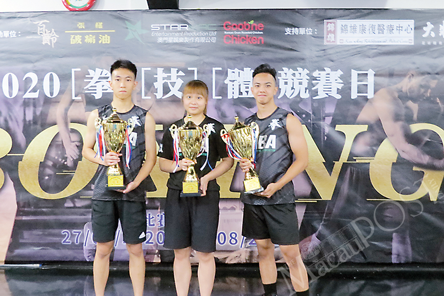 Overall winners (from left to right) Chan Hou In, Chan Man Man and Alvin John Reyes Salinas pose with their trophies at the Macao Boxing General Association’s (MBA) gym in Areia Preta on Saturday. Photo: Lesley Wells