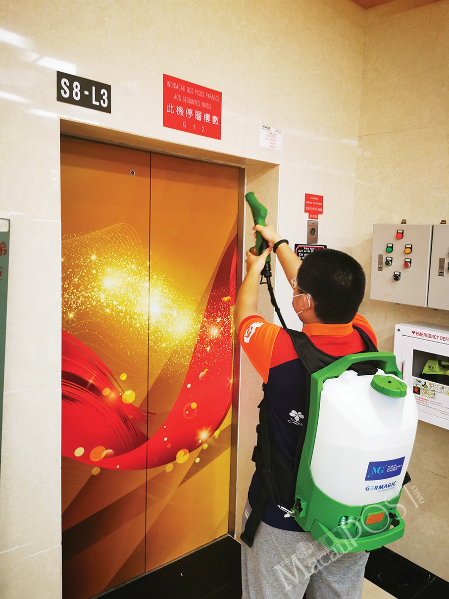 These photos provided by Fuhong Society of Macau show its members spraying Germagic to disinfect lifts on the University of Macau (UM) campus last Saturday.