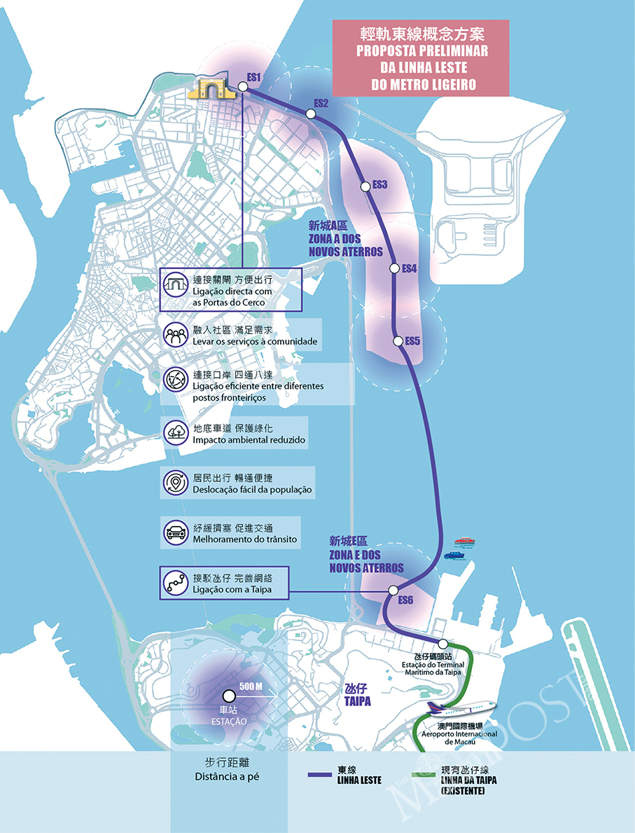 According to the proposal, the first station of the LRT “East” section will be built undersea off the northern coast of the peninsula, and will be a two-minute walk from the Barrier Gate checkpoint. The section will continue to run under the sea off the coast before arriving at the second station, which will be located outside the Residência Macau residential estate.