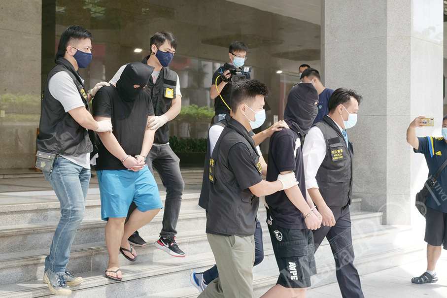 The hooded suspects are escorted by Judiciary Police (PJ) officers from the PJ headquarters in Zape to a vehicle yesterday.