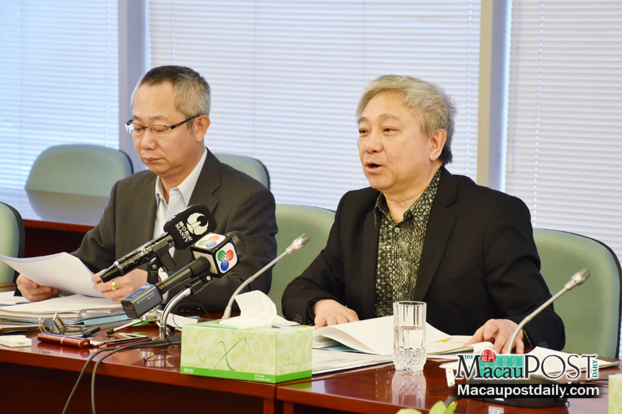 Lawmaker Andrew Chan Chak Mo (front) speaks to reporters after a meeting at the legislature about the tobacco control bill, as lawmaker Sio Chi Wai looks on. Photos: Leong Lok Ian