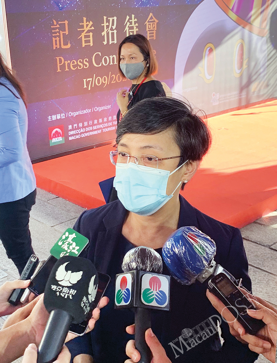 Macau Government Tourism Office (MGTO) Director Maria Helena de Senna Fernandes talks to reporters after yesterday’s press conference in Taipa about the upcoming “Macau Light Festival 2020 – Light Carnival”. Photo: Prisca Tang
