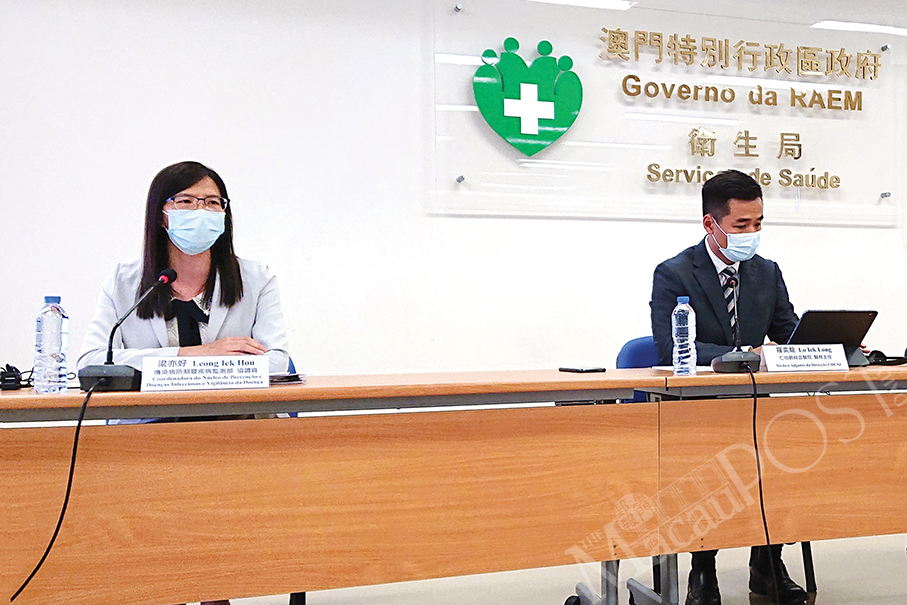 Health Bureau (SSM) Control of Communicable Diseases and Surveillance of Diseases Department Coordinator Leong Iek Hou (left) speaks during yesterday’s press conference about the city’s novel coronavirus (COVID-19) situation, as Alvis Lo Iek Long, one of the three clinical directors of the public Conde de São Januário Hospital Centre, looks at his tablet computer. Photo: Tony Wong