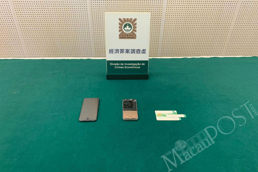 Evidence seized from the fraud suspect such as two smartphones are displayed during Friday’s special press conference about the case at the pressroom of the Judiciary Police (PJ) headquarters.