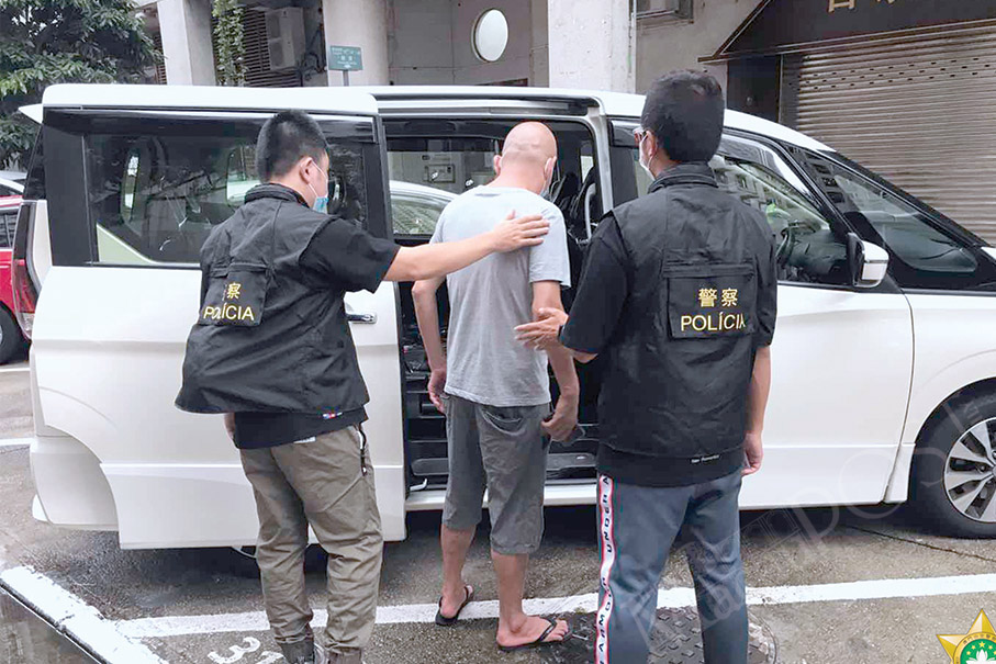 This handout photo provided by the Public Security Police (PSP) yesterday shows PSP officers escorting the suspect surnamed Pun to a vehicle in Avenida Norte do Hipódromo in Areia Preta district on September 12.