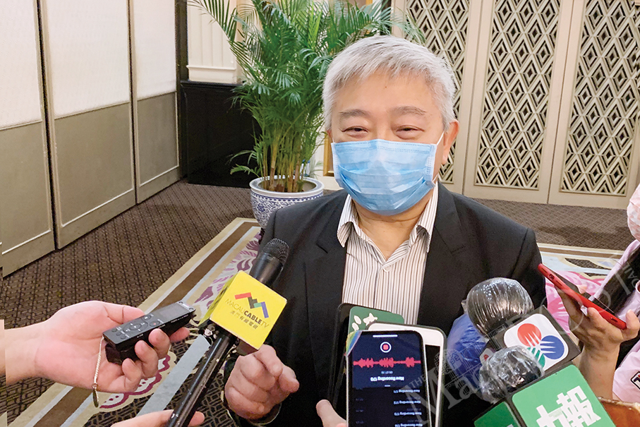 United Association of Food and Beverages Chairman Andrew Chan Chak Mo speaks to reporters on the sidelines of a meeting about the upcoming 20th Macau Food Festival, at The Plaza Restaurant yesterday.