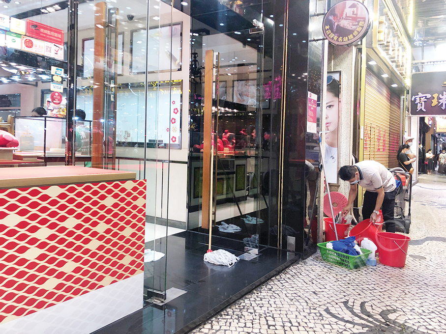 A man wearing a facemask arranges tools to clean a jewellery shop in Nam Van.