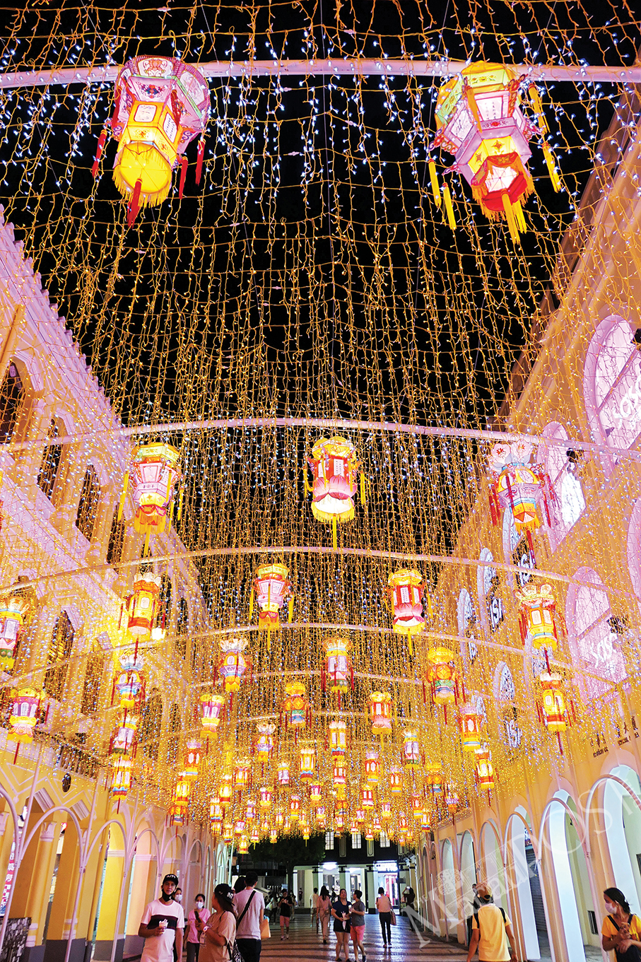Rows of lights and lanterns are hung over the pedestrian area in Largo do Senado last night.