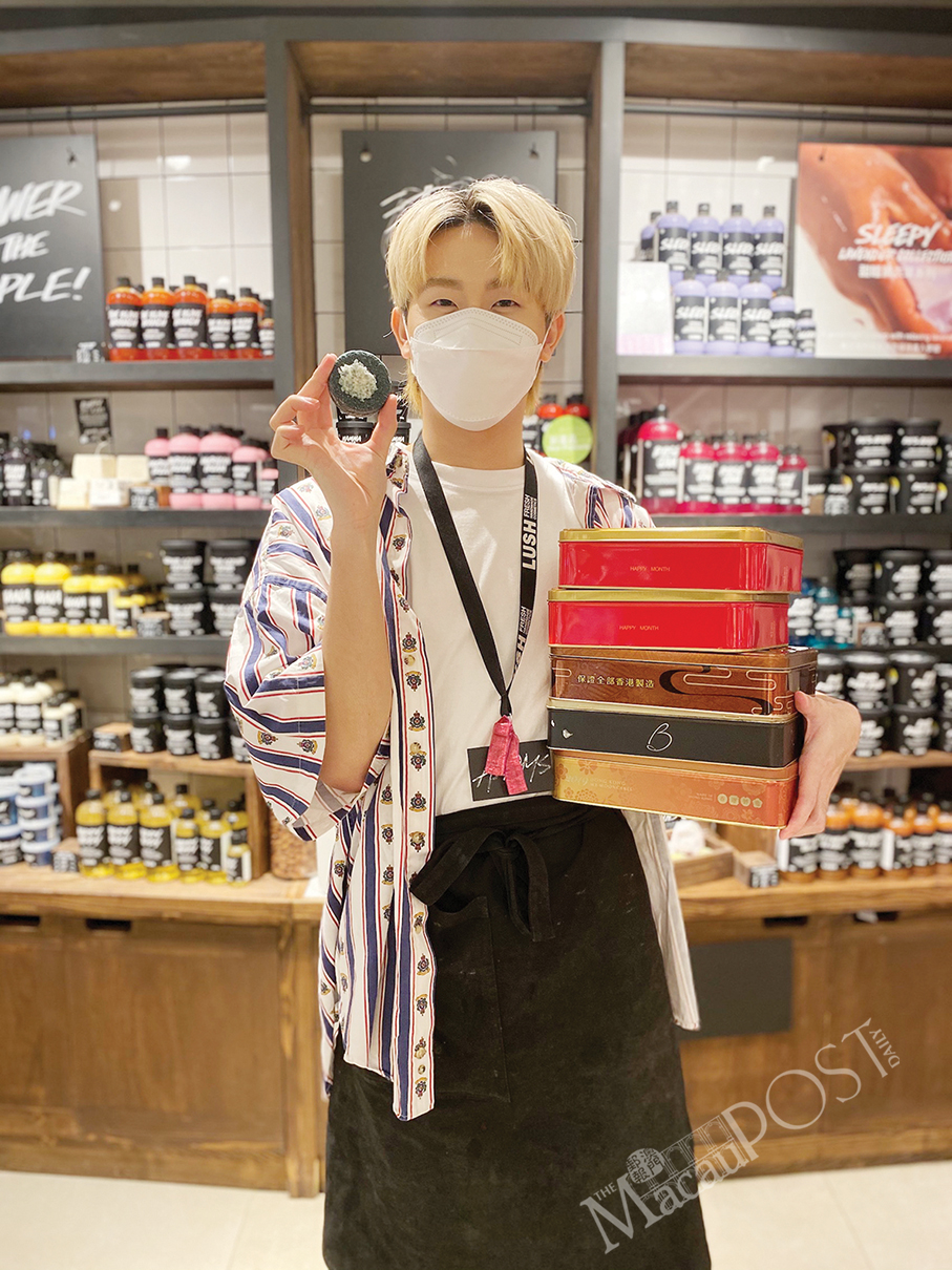 A Lush employee poses with mooncake tins and a shampoo bar to promote the cosmetics retailer’s mooncake tin recycling campaign at their store. Photo: Lush