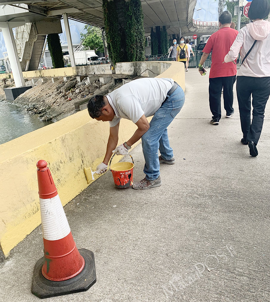 A man not wearing a facemask repaints the wall along the waterfront near the Outer Harbour Ferry Terminal.