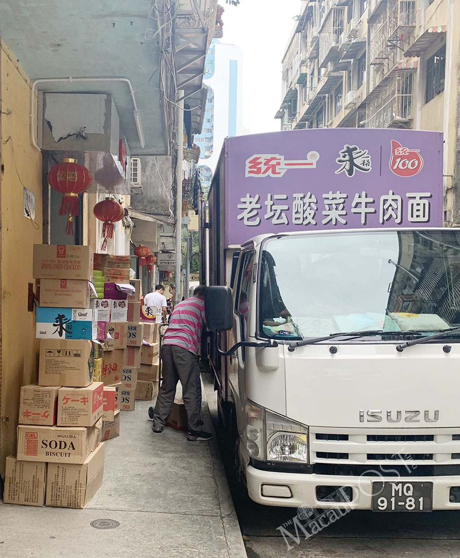A man unloads boxes of food from a van parked outside a store near Lou Lim Ieoc Garden.