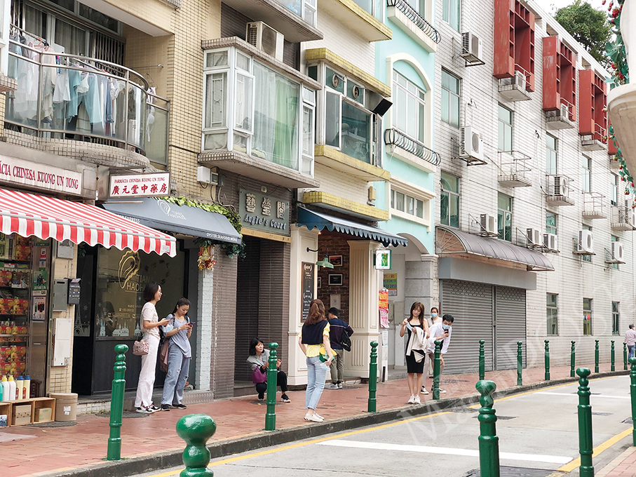 People pose as their friends take photos with their phones in a street in the old quarters of Taipa.