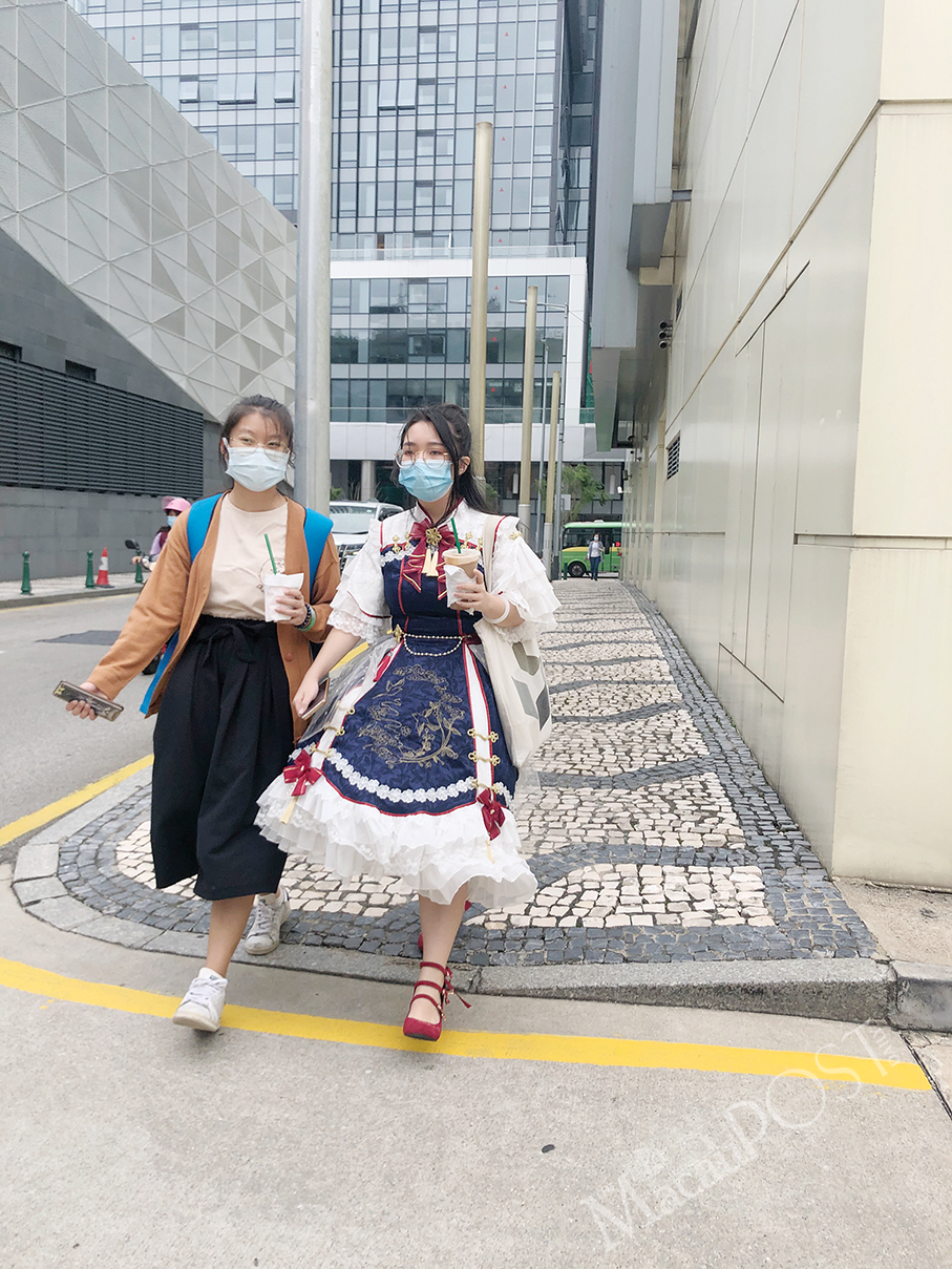 Two girls, both wearing facemasks, walk near the Macau Polytechnic Institute (IPM) campus in Zape.