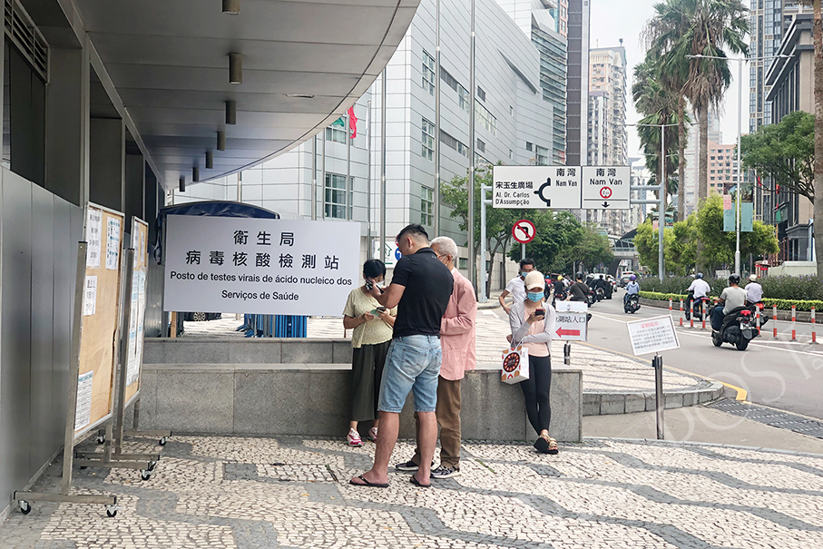 A man helps a senior citizen with digital registration for a COVID-19 nucleic acid test (NAT) outside a testing station at Macau Forum in Zape.