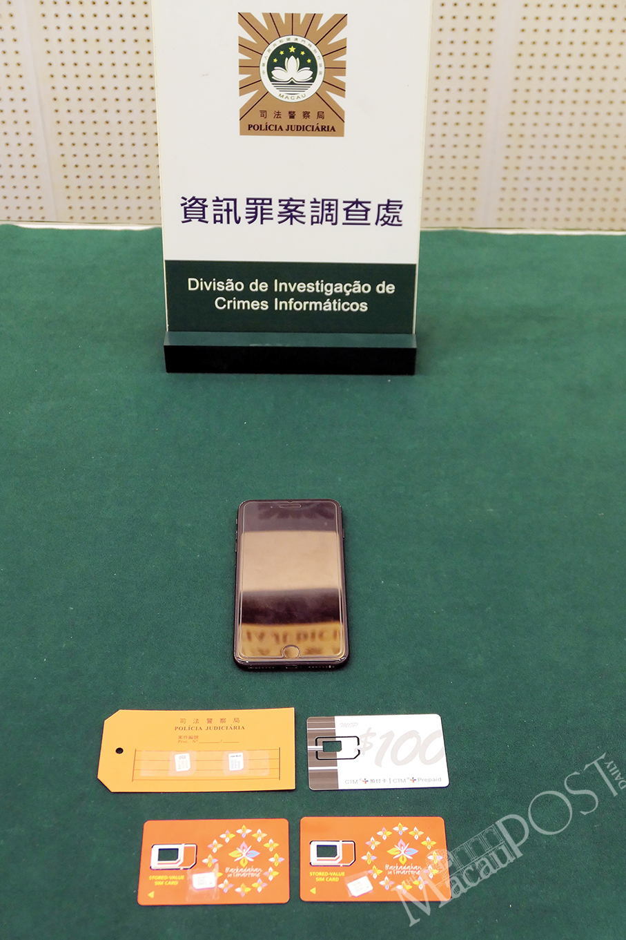 Evidence seized from the suspect such as a smartphone and three phone cards is displayed during Friday’s special press conference about the gay sex scam case at the pressroom of the Judiciary Police (PJ) headquarters.
