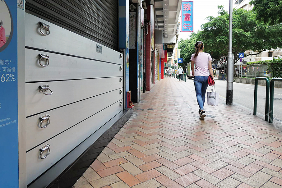A pedestrian walks yesterday past a shop’s flood protection barrier in Avenida de Horta e Costa while the No.8 signal was up. Photo: Iong Tat Choi