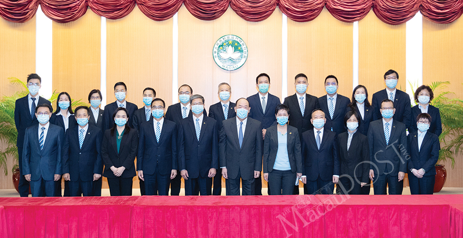 Chief Executive Ho Iat Seng (centre, first row) poses yesterday with members of the influential General Union of Neighbourhood Associations (generally known as Kai Fong – its name in Cantonese) at Government Headquarters yesterday. According to a statement by the Macau Government Information Bureau (GCS), Ho listened to the Kai Fong representatives’ views and proposals about next year’s government programme. Ho is slated to deliver his 2021 Policy Address next month. The statement said Ho told the representatives that he planned to reform the public Macau Foundation (FM) to ensure a “more efficient” use of public funds. The foundation, which is funded by 1.6 percent of the gross gaming revenues of Macau’s casinos, has been widely criticised for its seemingly erratic way of handing out or refusing subsidies to local organisations that observers have described as “unfair” and “spendthrift”. According to the GCS statement, Ho also promised that the government’s expenditure on social welfare, education and health would not be affected by its spending cuts in response to the COVID-19 pandemic’s adverse impact on the local economy. Ho also said that “the life, safety and health of the population are more important than economic development.” The chief executive was also quoted as saying that Macau’s efficiency in fighting the novel coronavirus disease was “not an easy conquest”, urging the public not to let their guard down in preventing the epidemic.