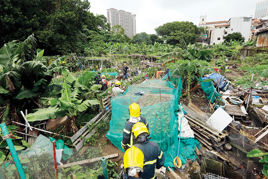 This photo released on Wednesday shows officials from several government entities, including firemen, clearing and repossessing several plots on the former Iec Long Firecracker Factory site in Taipa earlier that day. Photos: DSSOPT